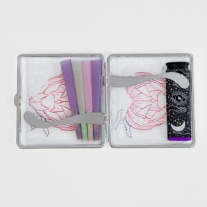 These cute cases can be used to store standard sized cigarettes, joints, birth control, business cards, credit cards, and money. They have two metal arms that help keep your stuff in place.